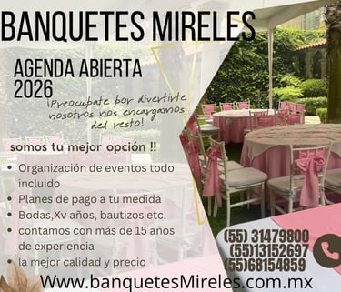 En Banquetes Mireles, entendemos que el día de tu boda es uno de los momentos más importantes de tu vida. Estamos aquí para transformar la boda que tienes en mente en una celebración inolvidable y perfecta, cuidando cada detalle para que tú solo te concentres en disfrutar.